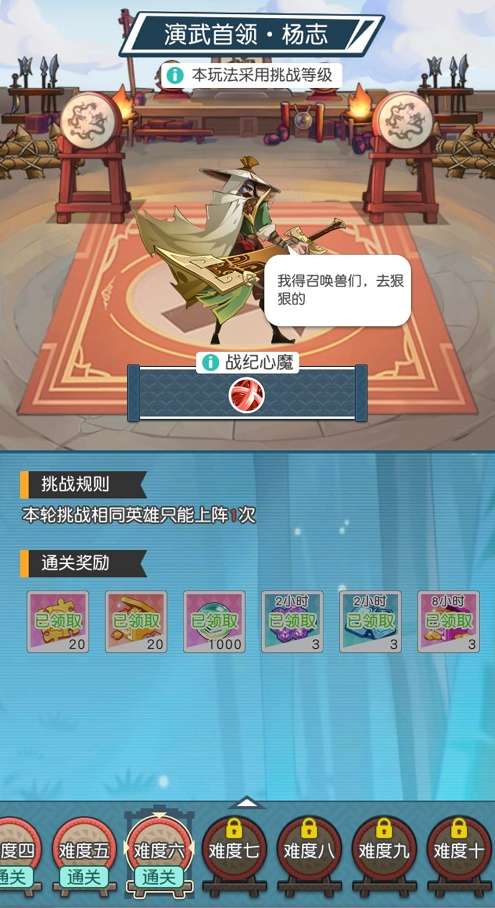 3、敌方英雄(神话杨志、神话魏定国、神话柴进)VS我方英雄(方片三人组)站位:近战前排远程后排(正常输出即可)该阵容应对关卡难度:★★,一次性过关几率:99%。