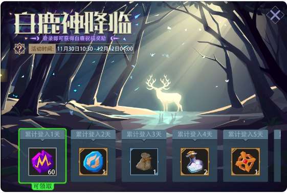 活动内容:白鹿神降临,带来祝福与奖励。活动期间,每日登录游戏即可领取对应奖励。