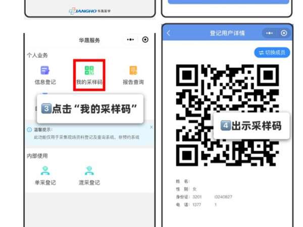 2、选择好信息,找到提交,点我的采样码,选择切换成员即可获取孩子的采样码。