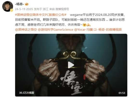 杨奇表示:“Wegame平台将于2024.08.20同步发售,目前预售暂未开启。野路子团队,可能封版前一晚还在通宵改东西……诸多计划思虑不周,感谢老师们几年来胸怀明月,休休有容。”