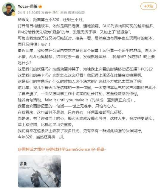 “最近两年,我经常在公司内突然注意到某个屏幕上运行着一个陌生的游戏,画面还不错,战斗也挺精彩,结果过去一看,发现就是黑猴……我是谁?我在哪?晚上要吃什么?这是我们的妖怪吗?技能动画帅哭了,为啥我上次看的时候移动还在摆T-POSE?这是我们的关卡吗?光影怎么这么好看?我记得上周还在吐槽乌漆嘛黑啊。这是我们的主角吗?什么时候加入这个法术的?这战斗方式也太西游了吧!”