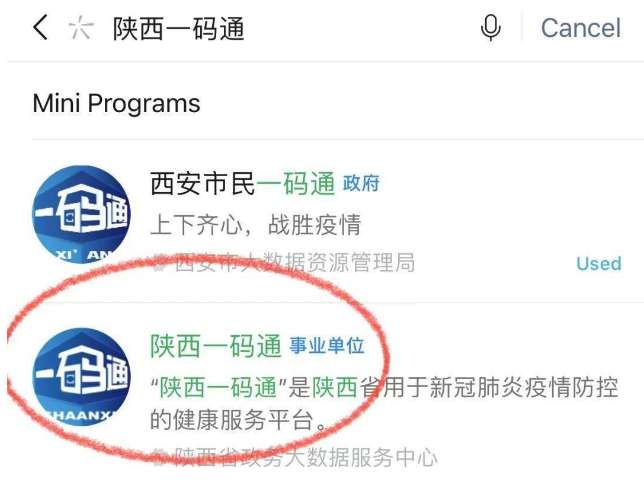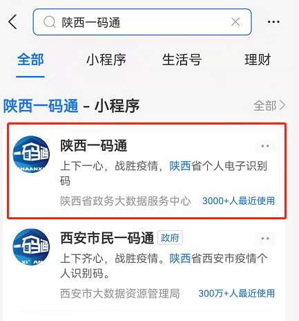 2、输入陕西一码通进入搜索,点击下图框中小程序进入。