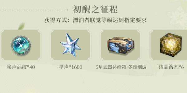 1、漂泊者们可在游戏内累计免费获取84枚唤声涡纹、14枚浮金波纹、1800枚星声,以及自选5星武器、自选4星武器、羁旅印章·启程、4星共鸣者散华、4星共鸣者·渊武等珍贵奖励。
