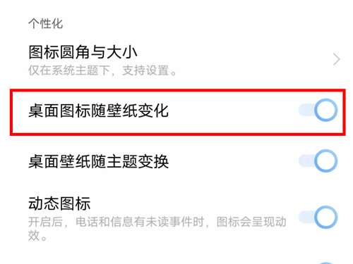 3、将【桌面图标随壁纸变化】右侧的开关打开即可。