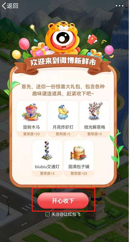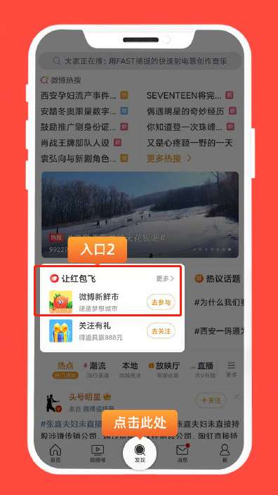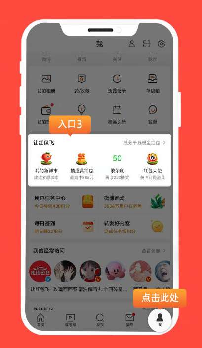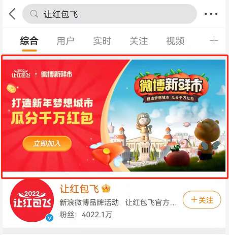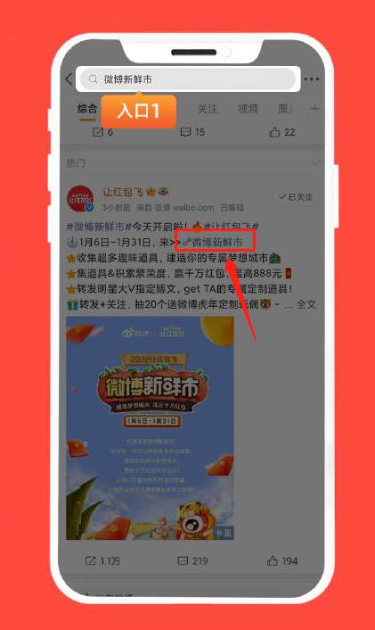 入口一:在发现页搜索“微博新鲜市”点击让红包飞官微链接即可进入