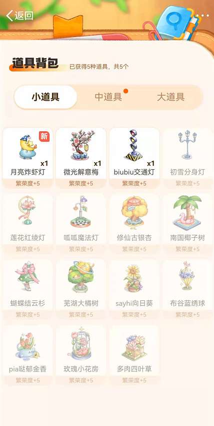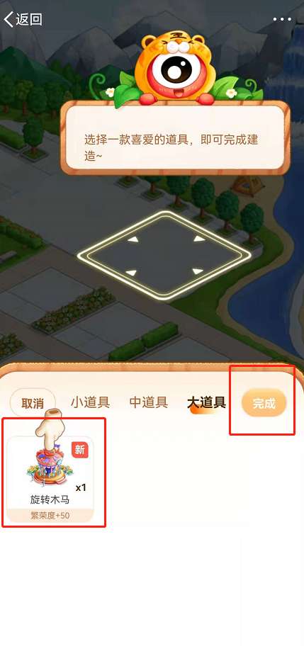 4、在下方出现的道具中有大中小三种,分别对应土地类型,大家按类选择道具,点击完成。