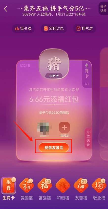 4、最后在生肖卡页面点击找亲友激活分享给好友,当好友为你激活后就能拥有并且参与抽奖。