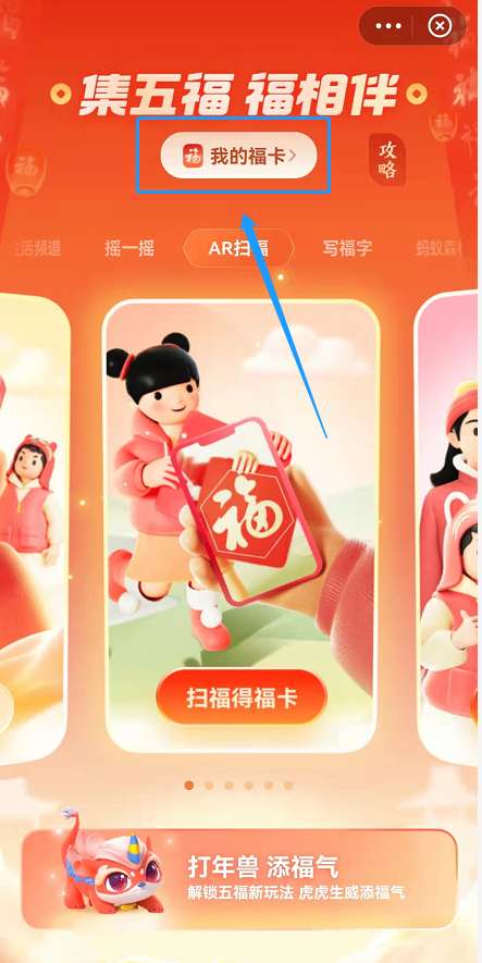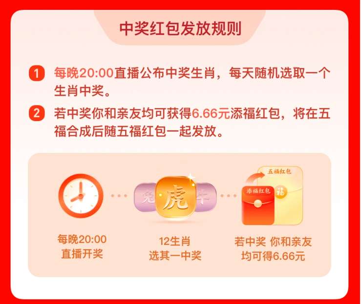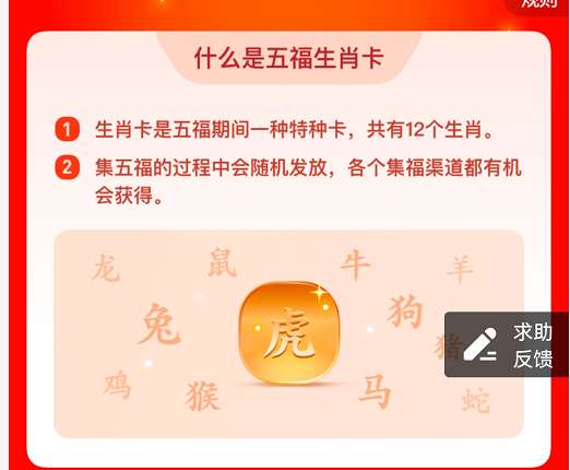 生肖卡在1月21—1月31日可以通过AR扫任意福字、写福字、分享福字、蚂蚁森林巡护、蚂蚁庄园捐单蛋、摇一摇、看生活频道等集福方式来获得未激活的生肖卡,随机发放,一共有12个生肖。