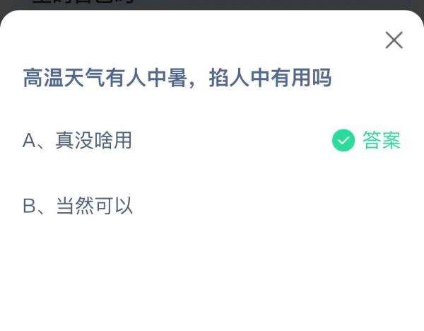 2022支付宝蚂蚁庄园6月25日的题目为:高温天气有人中暑掐人中有用吗?答案是什么呢?很多小伙伴可能还不太清楚。下面小编就为大家带来了正确答案分享,希望能帮助到你。