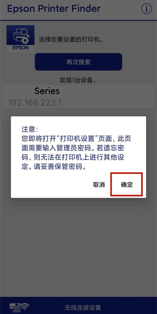 2、开启EPSON printer finder,自动连接上打印机之后选择确定。