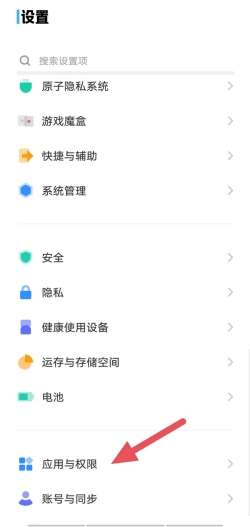 2、在手机设置页面后,找到并选择【应用与权限】选项。