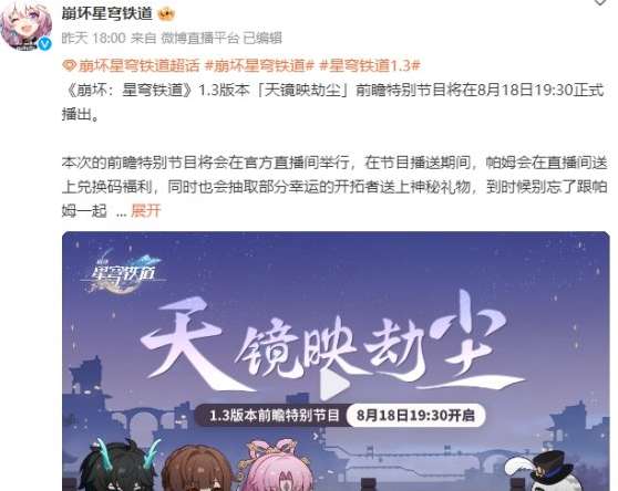 《崩坏:星穹铁道》1.3版本直播将在8月18日播出。