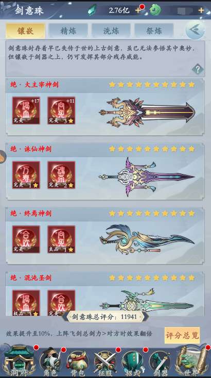 升级:使用(古剑感悟)进行升级,材料可通过获取途径三快速领取,每升一级都会增加大量属性效果,达到要求后会激活随机属性加成,当然剑意珠属性也会随着升级提升,剑意珠级别分为:残缺--凡品--良品--极品--完美5档