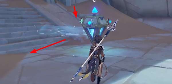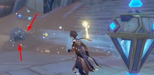 3、紧接着我们需要攻击三次下图的蓝色装置,将装饰发出的蓝色波纹朝向左侧箭头指引位置。