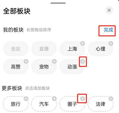 3、接着,长按板块还可以拖动先后排列顺序,点击完成即可。