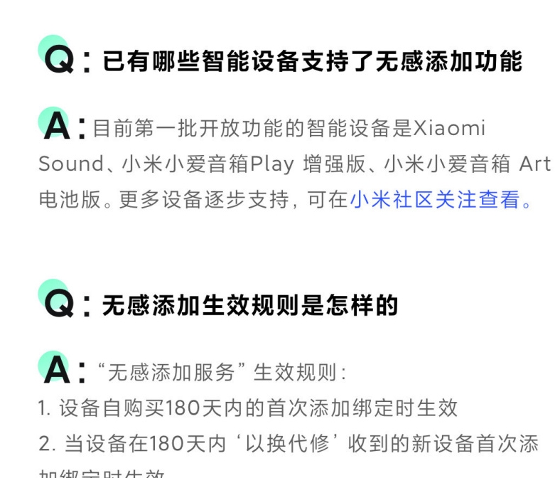4、无感添加支持的设备为小米 Sound、小爱音箱 Play 增强版、小爱音箱 Art 电池版。服务在 180 天内有效,支持首次绑定。