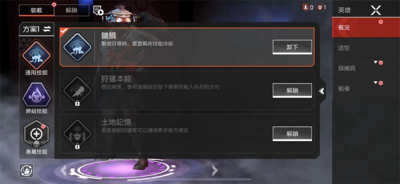 以英雄“寻血犬”的能力槽为例,其通用技能可选择“饥饿”、“狩猎本能”、“土地记忆”其中一种,“饥饿”的技能效果鼓励玩家保持攻势:击倒目标时,重置战术技能冷却;而“狩猎本能”的效果则侧重于强化英雄的索敌能力:标记线索,会有渡鸦指示留下线索的敌人所在的方向。