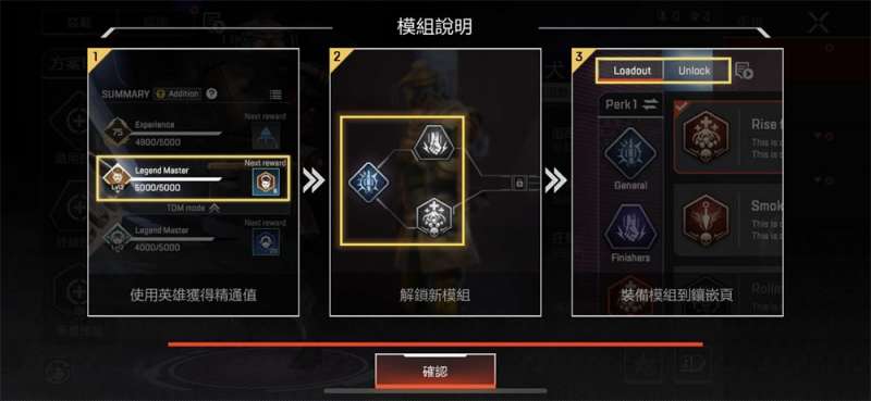 自精通奖励中获取的被动技能,可以镶嵌于英雄的模组槽位。每位英雄都有三种模组槽位,对应不同维度的能力,分别是:通用技能、终结技能、专属技能。