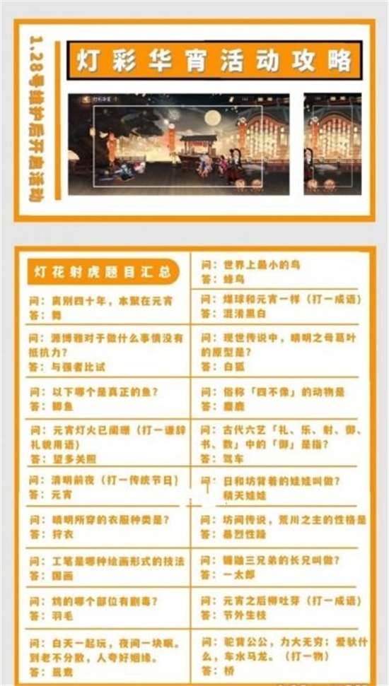 好啦~以上就是2023灯彩华宵灯花射虎灯谜答案大全合集啦~看完,你是不是就比较清楚阴阳师最新的元宵节猜灯谜答案是什么了呀~