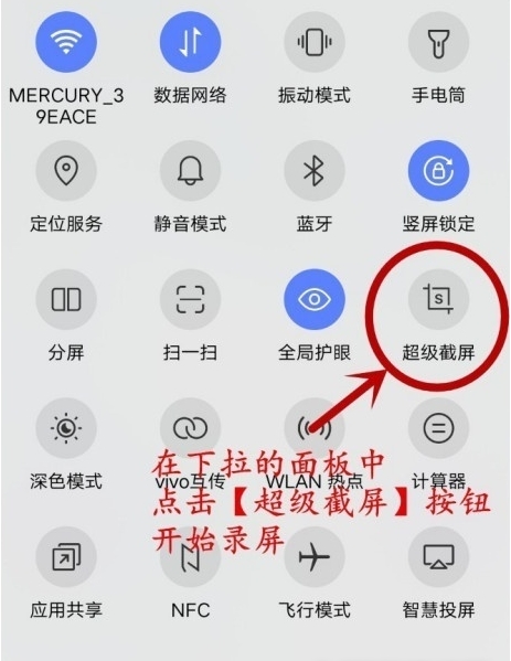 1、解锁屏幕,从顶部向下滑动,点击“超级截屏”。