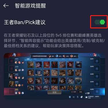 3、将王者Ban/ Pick建议右侧开关打开即可。