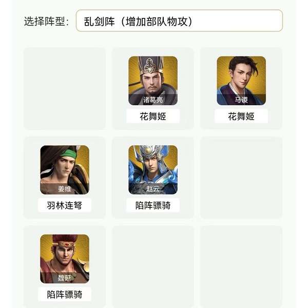武将兵种搭配姜维(穿云剑客)魏延(穿云剑客)诸葛亮(擂鼓队)赵云(羽林枪卫)黄月英(花舞姬)