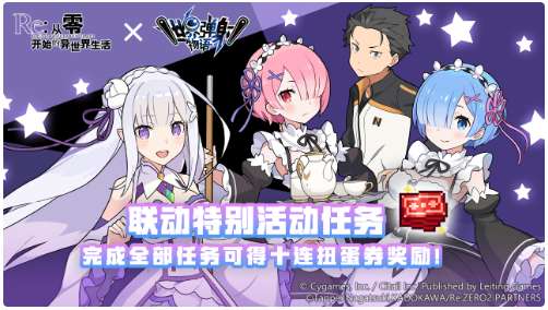 ◇为庆祝联动活动开启,将举办「Re:从零开始的异世界生活 联动特别活动任务」!活动期间将开启全新活动任务,完成任务后即可获得丰厚奖励!完成2弹所有任务还能额外获得「通用角色十连扭蛋券」!