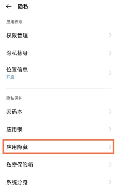 2、在隐私页面点击【应用隐藏】。
