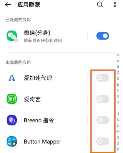 3、选择需要隐藏的应用,将右侧的开关开启即可。