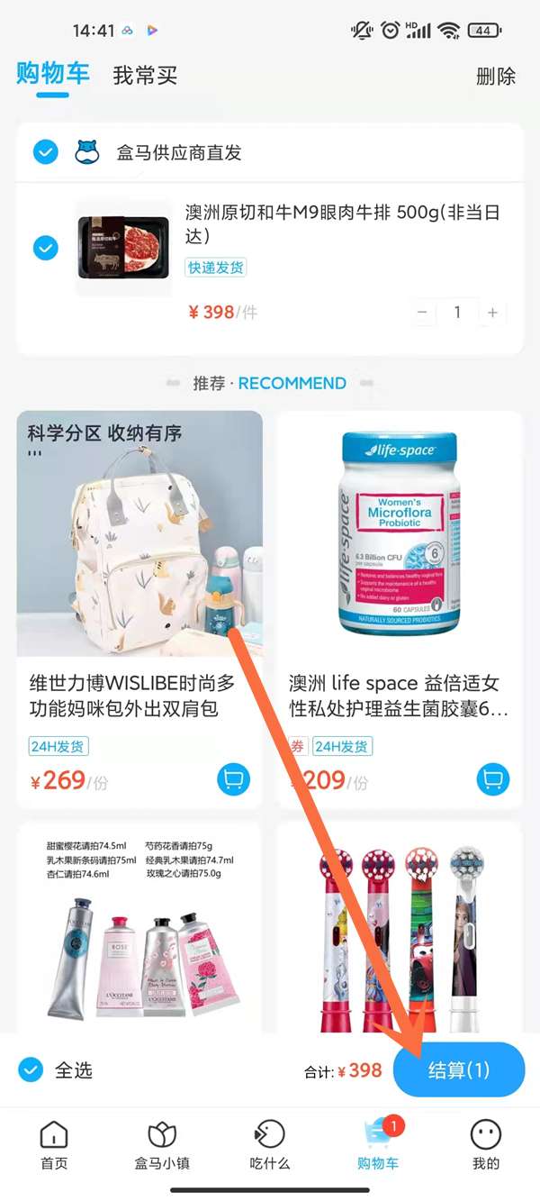 1、开启盒马软件,将需要的商品添加到购物车中,在购物车页面中的右下角点击结算选项。