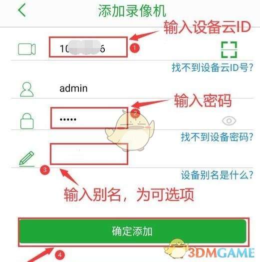 3、随后,输入事先准备好的云ID、输入密码、填写别名等,之后点击“确定添加”按钮即可完成设备添加。