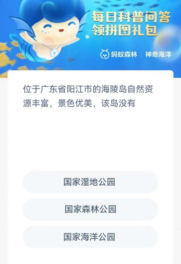 支付宝蚂蚁森林神奇海洋6月28日题目已经更新,今天的题目为:位于广东省阳江市的海陵岛自然资源丰富景色优美该岛没有?下面小编就为大家带来了支付宝神奇海洋6月28日答案,神奇海洋今日答案,我们一起来看看吧!