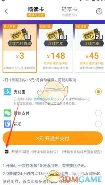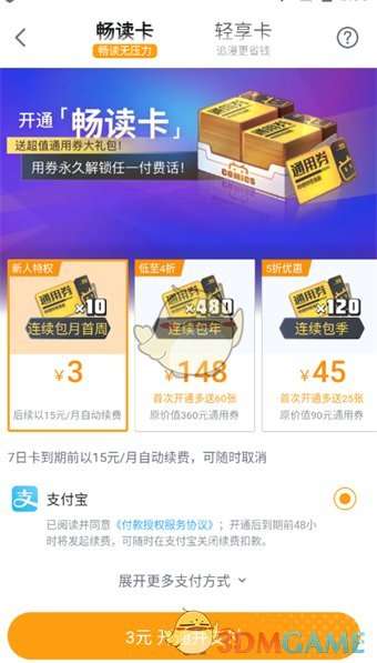 3、进入畅读卡界面,选择你想要购买的【礼包】和【支付方式】。