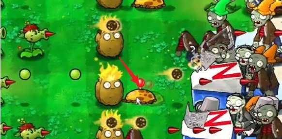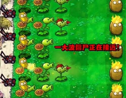 2、第一波僵尸出现后将豌豆向日葵摆放两列,然后在人多的位置可以放土豆雷和火炬坚果。
