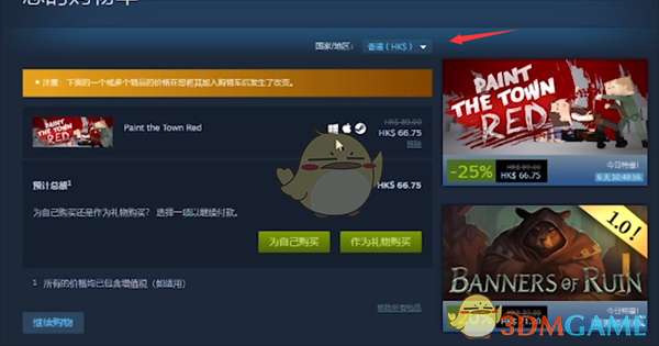 2、选择一件购物车中想要购买的商品 ,点击购物车右上方的【国家/地区】选项,将币种切换至人民币,最后点击下方的为自己购买,付款后即可将自己的区域切换至相应的服务器。