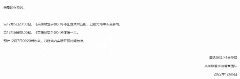 以上就是英雄联盟手游12月6日最新停服的公告详情。