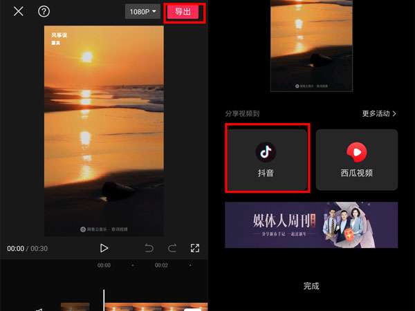 2、点击导出,导出完成后,点击分享到抖音。
