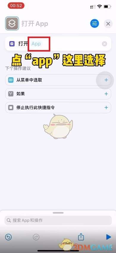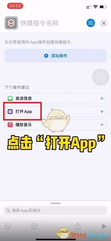 3、然后点击新建快捷指令页面的【打开app】操作建议;