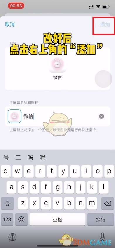 9、设置完成后点击右上角的【添加】即可将你的微信图标更换。