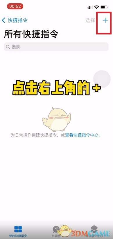 2、在快捷指令应用中,点击右上角的【+】按钮新建一个快捷指令;