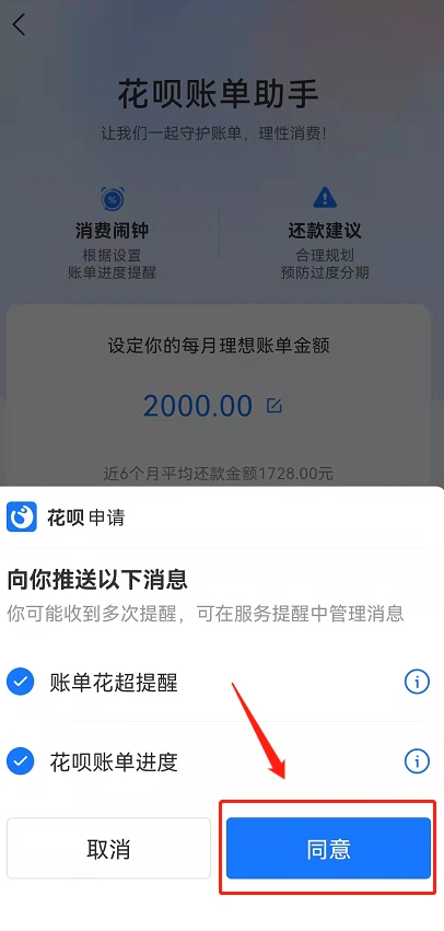 3、当你同意订阅后,这时页面会提示花呗会向你发送花超提醒及账单进度,点击同意。
