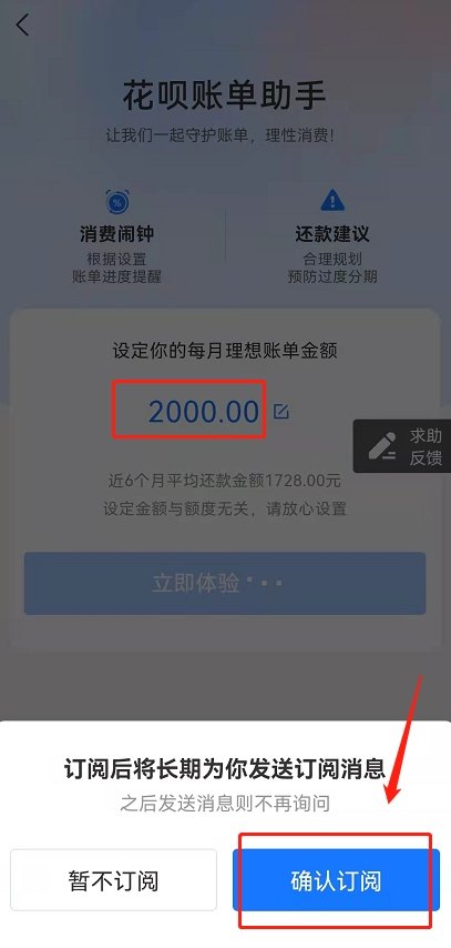 2、这时会进入如下页面,用户们先修改一个理想金额,然后点击立即体验,同意下方确认订阅。