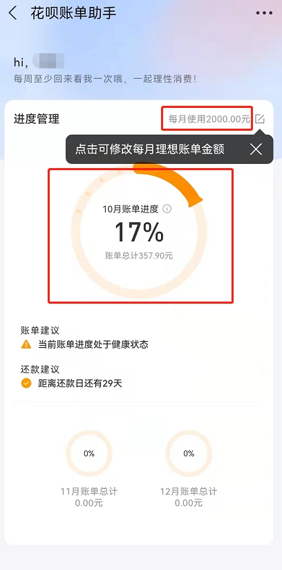4、最后在这用户们就可以看到花费进度百分比,点击进度管理可修改理想金额。