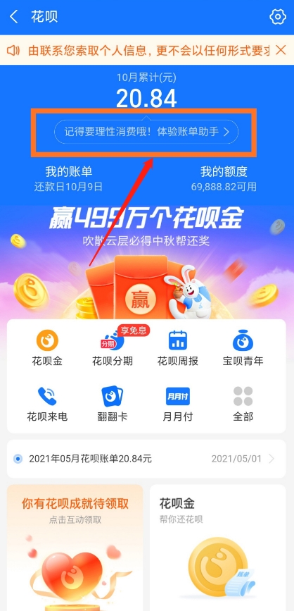 1、打开在支付宝我的页面点击进入花呗主页,在花呗主页可以看到下图框中账单助手功能,点击进入。