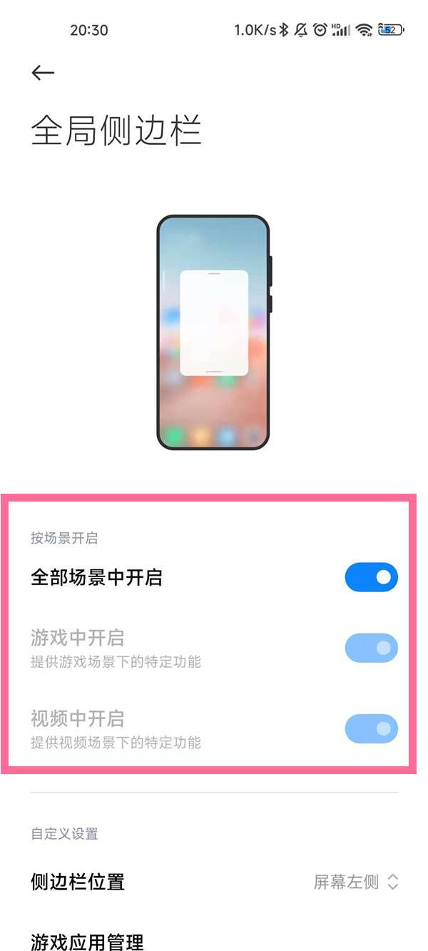 3、将全局侧边栏界面中的全部场景中开启的按钮打开即可。