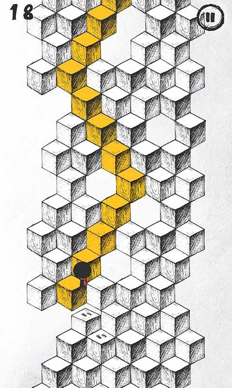 单从第一款「阶梯英雄」来说,就足以让我喝上一壶——火柴人会在无规律分布的方块阶梯上不断跳跃,而我们需要点击屏幕让它转向来避免从阶梯的空隙中掉落。