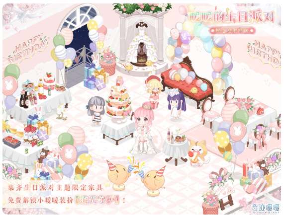 12月2日5:00—12月11日23:59,在小屋愿之庭的限时抽奖阁“暖暖的生日派对”许愿,可获得生日主题家具!集齐所有限定家具还可领取全新小暖暖装扮“流光守护”!