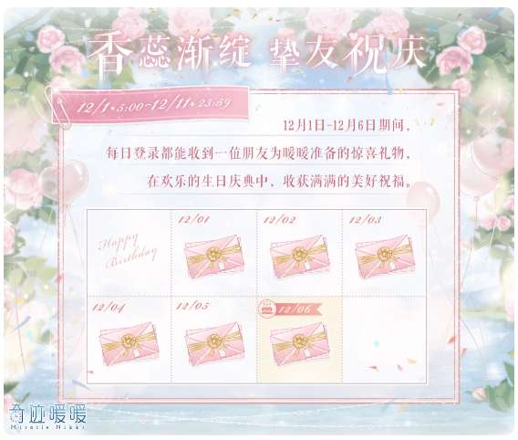 12月1日5:00—12月6日23:59,每日5点后可前往“时遇瑰途”活动界面,收获来自朋友们的祝福和生日礼物。活动期间一共可收获6位朋友的祝福,领取共计【1000钻石】生日大礼!