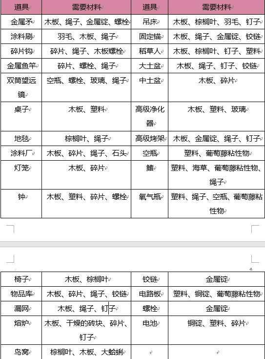 塑料:塑料是建造木筏和制作许多工具的重要材料。漂浮在海面上的塑料瓶和碎片可以用钩子收集。