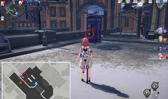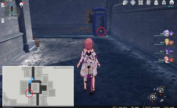3、找到下图中标记位置,调查电话亭,即可获得20冬城盾。